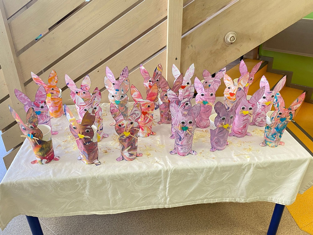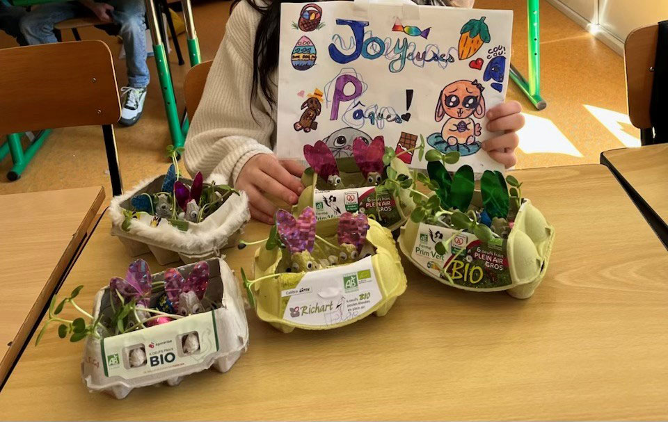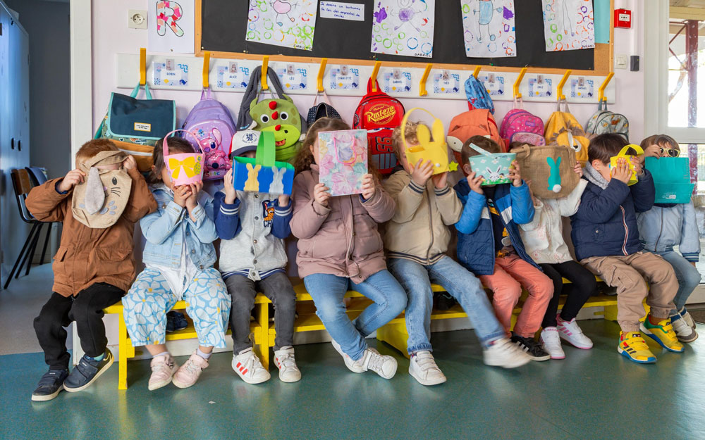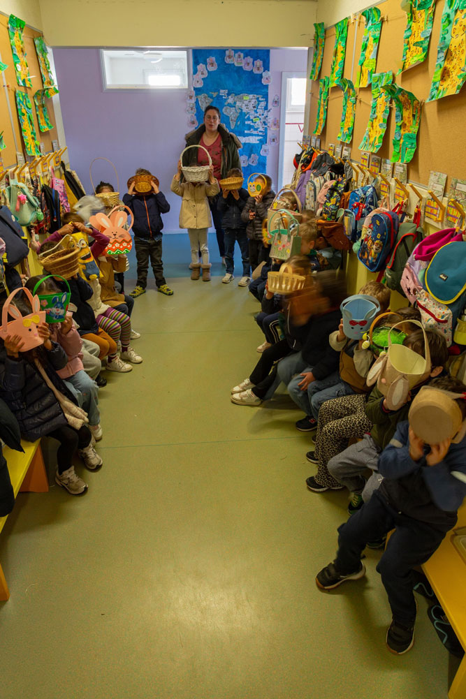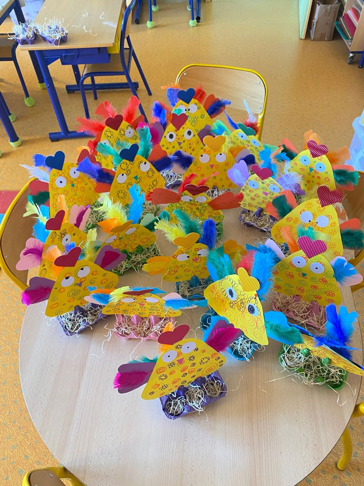 Une fois toutes les cachettes trouvées et les paniers bien remplis, chaque classe a reçu un immense panier rempli de petits œufs en chocolat. Les œufs ont été l’occasion de travailler le partage équitable, le dénombrement, ainsi que le tri. Chaque enfant est reparti avec 8 petits œufs dans son bricolage de Pâques.