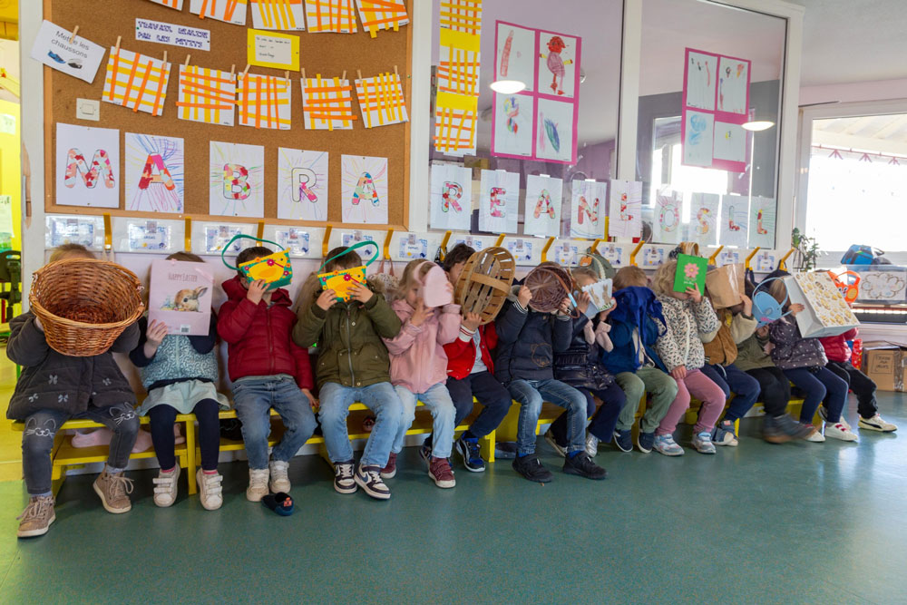 Une fois toutes les cachettes trouvées et les paniers bien remplis, chaque classe a reçu un immense panier rempli de petits œufs en chocolat. Les œufs ont été l’occasion de travailler le partage équitable, le dénombrement, ainsi que le tri. Chaque enfant est reparti avec 8 petits œufs dans son bricolage de Pâques.